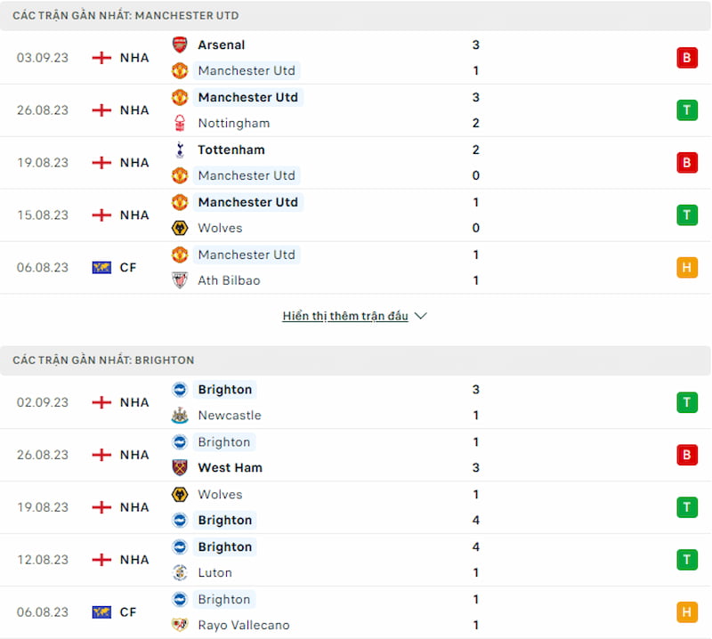 Thành tích đối đầu của Man United trước Brighton cũng là khá tệ. Tính trong 5 lần gặp gỡ gần nhất của cả hai, Quỷ Đỏ chỉ mới có được duy nhất 1 chiến thắng. Phần còn lại, đội chủ nhà đã để cho đối thủ đánh bại đến 3 lần cùng với đó là một trận hòa trong 90 phút thi đấu chính thức. Với những con số thống kê như hiện tại, dù được chơi trên sân nhà thế nhưng thầy trò Erik ten Hag vẫn không có cơ hội giành được chiến thắng quá cao.